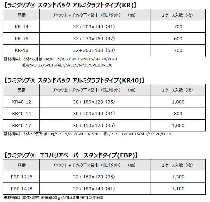 材質構成(本体):クラフト紙50g / PE15 / AL7 / SPE15 / NY15 / SPE20 / PE40