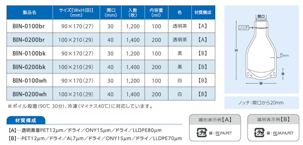 - 機能:ボイル殺菌(90℃30分)および冷凍(−40℃)に対応しています。